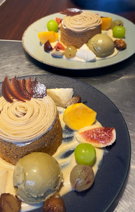香ばしいほうじ茶のアイスと、とろりとしたマロンソースを添え、旬のフルーツが秋の彩りを添えます。
