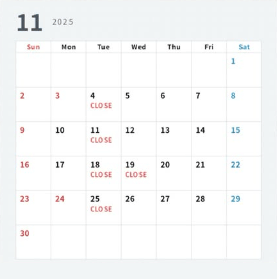 【11月休業日】 ・4日(火) ・11日(火) ・18日(火) ・19日(水) ・25日(火)