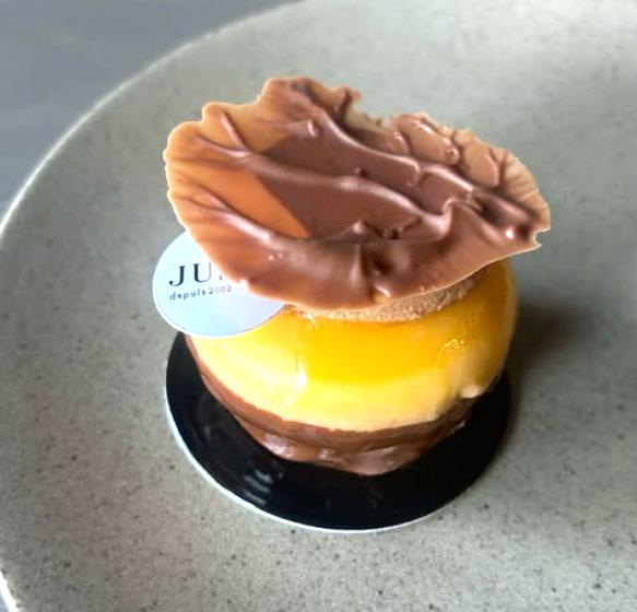 キャラメル風味のムースショコラに、爽やかなオレンジのジュレとオレンジクリームを重ねた一品。
