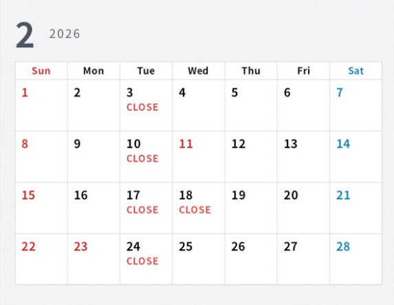 【2月休業日】 ・2月3日(火) ・2月10日(火) ・2月17日(火) ・2月18日(水) ・2月24日(火)